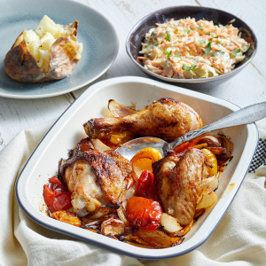 Day 5 of the £2 a day food budget challenge for one person is delicious Traybake chicken with jacket potato and homemade coleslaw